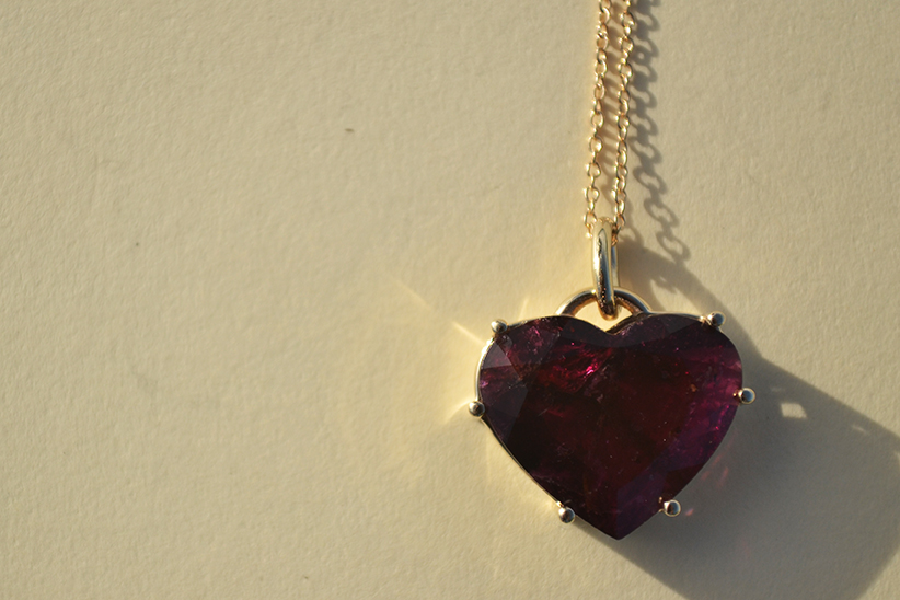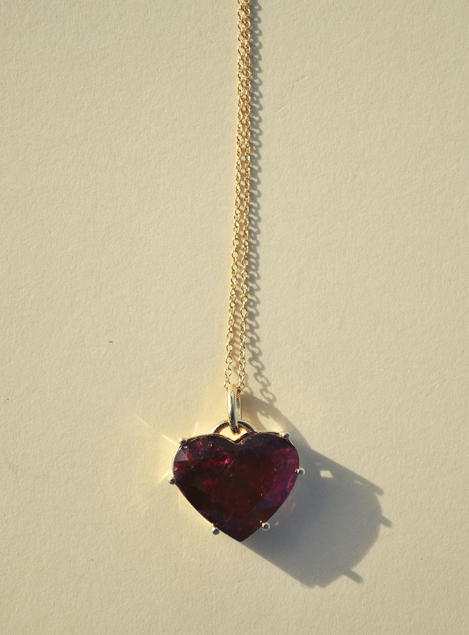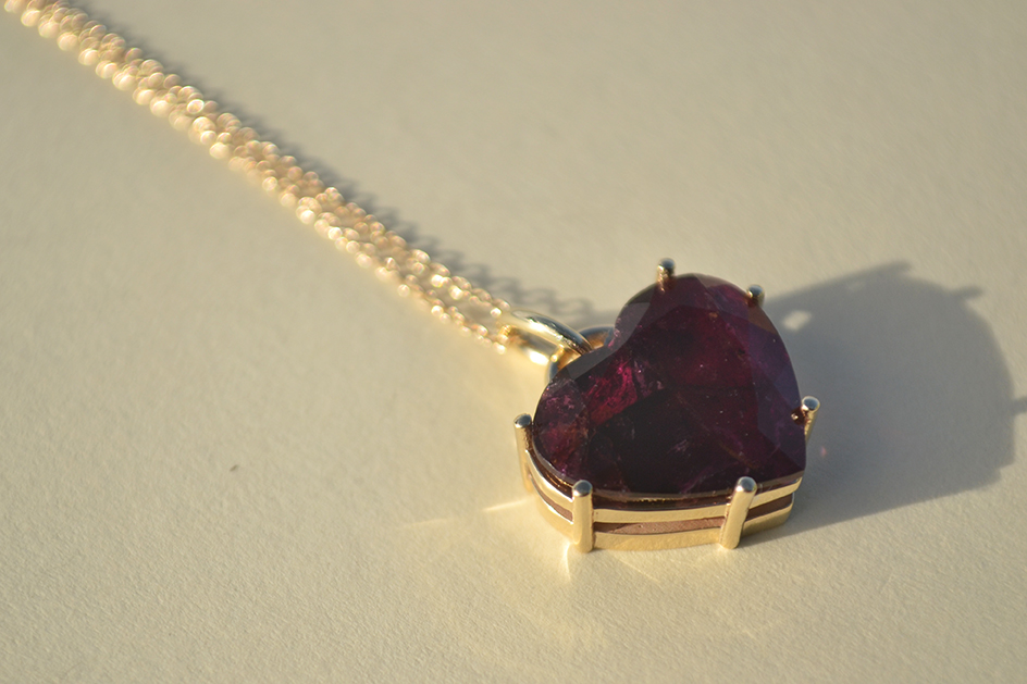 Enamórate de las fascinantes profundidades de esta turmalina natural en forma de corazón. Su tono rico y vibrante se complementa maravillosamente con el cálido brillo del engaste de oro amarillo de 14k. Viene completo con la elegante cadena de oro. Una verdadera declaración del corazón.